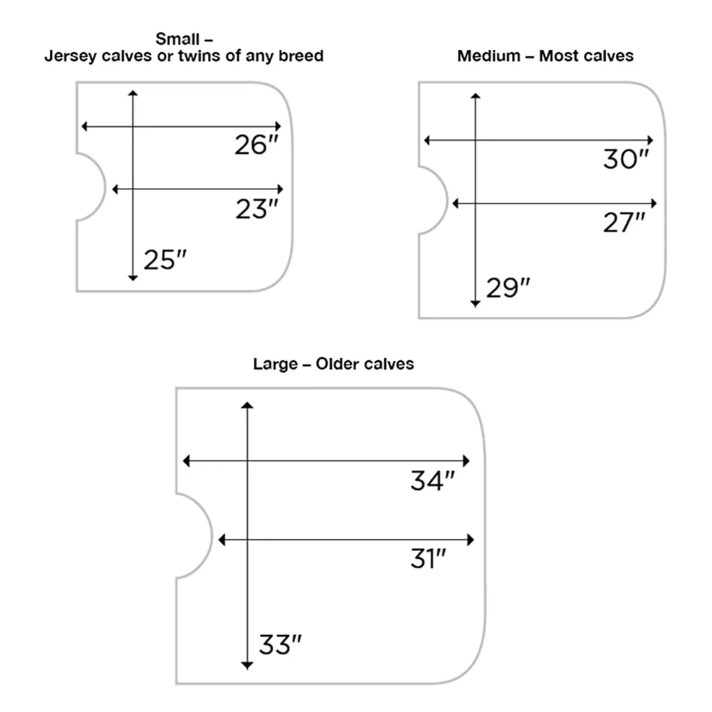 Medium size measures 27″ from base of head to tail, 29″ wide; sized to fit most newborn Holsteins and other breeds. Black, blue or pink.