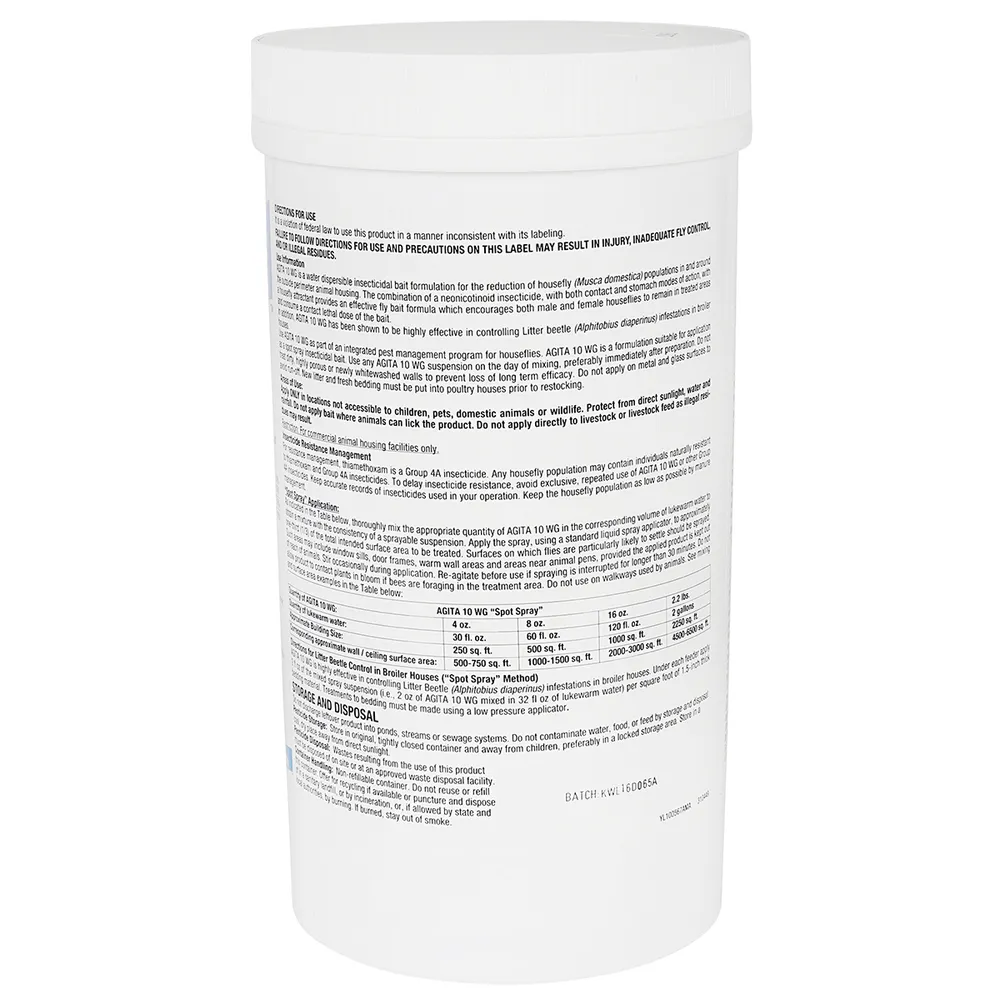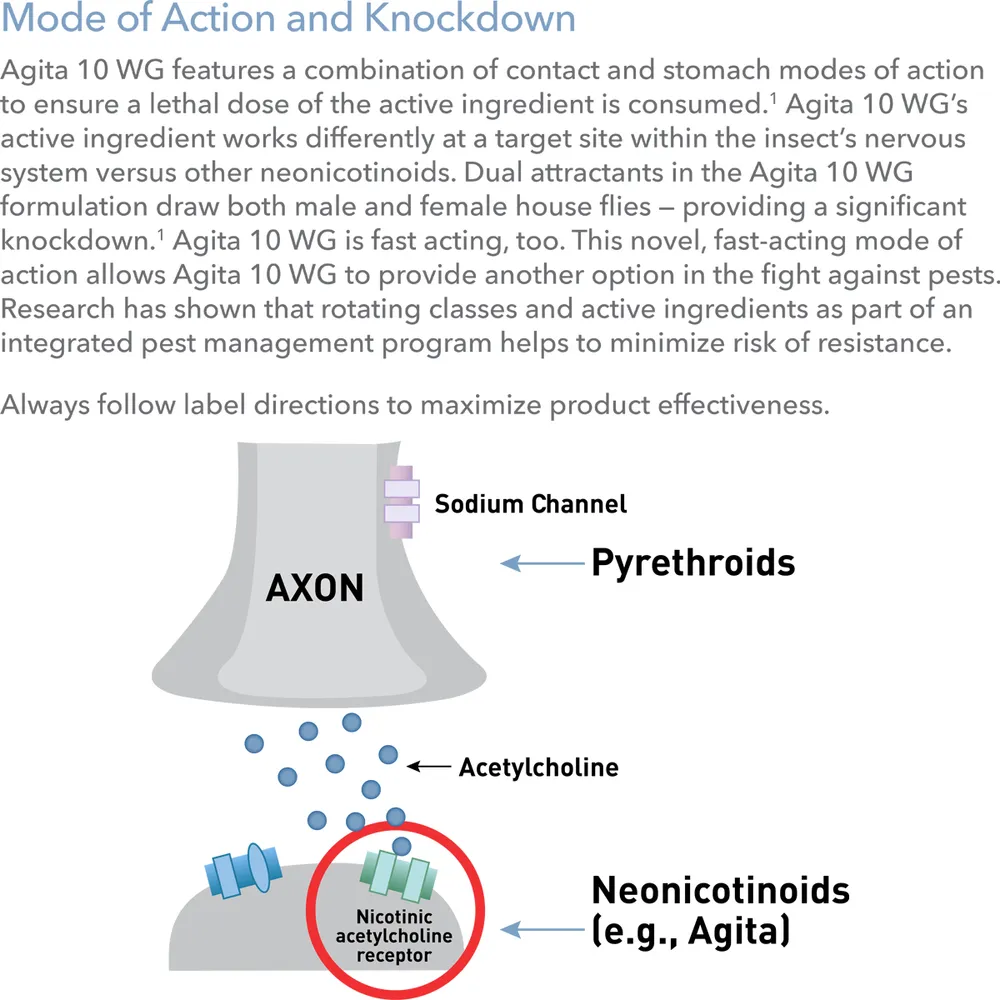 Directions: Use as part of an integrated pest management program for house flies. For application as a spot spray insecticidal bait. Use suspension on day of mixing, preferably immediately after preparation. Mix quantity indicated on label in corresponding volume of lukewarm water. Apply using standard liquid spray applicator to approximately 1/3 of total intended surface area to be treated, stirring occasionally. Surfaces on which flies are particularly likely to settle should be sprayed. Re-agitate before use if spraying is interrupted for longer than 30 minutes. See label for additional information and for instructions for litter beetle control in broiler houses. Apply only in locations not accessible to children, pets, domestic animals or wildlife. Protect from direct sunlight, water and rainfall. Do not apply directly to livestock or livestock feed. For commercial animal housing facilities only. Do not allow product to contact plants in bloom if bees are foraging in treatment area.