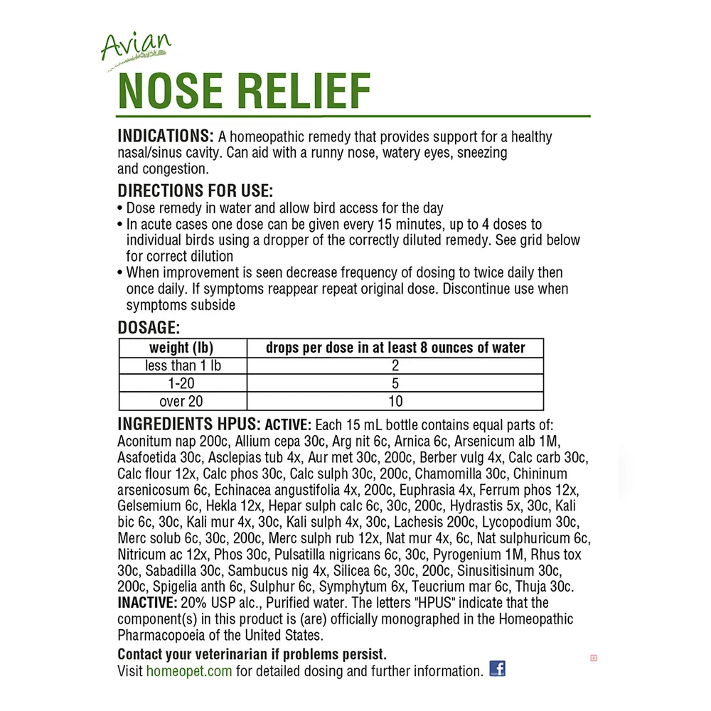 Directions: Dose remedy in water and allow bird access for the day. In acute cases, one dose can be given every 15 minutes, up to 4 doses to individual birds using a dropper of the correctly diluted remedy. When improvement is seen, decrease frequency of dosing to twice daily then once daily. Repeat if necessary. Discontinue use when symptoms subside. For birds less than 1 lb – 2 drops per dose in at least 8 oz water; 1-20 lbs – 5 drops per dose in at least 8 oz water; over 20 lbs – 10 drops per dose in at least 8 oz water. Minimum of 450 drops per bottle.