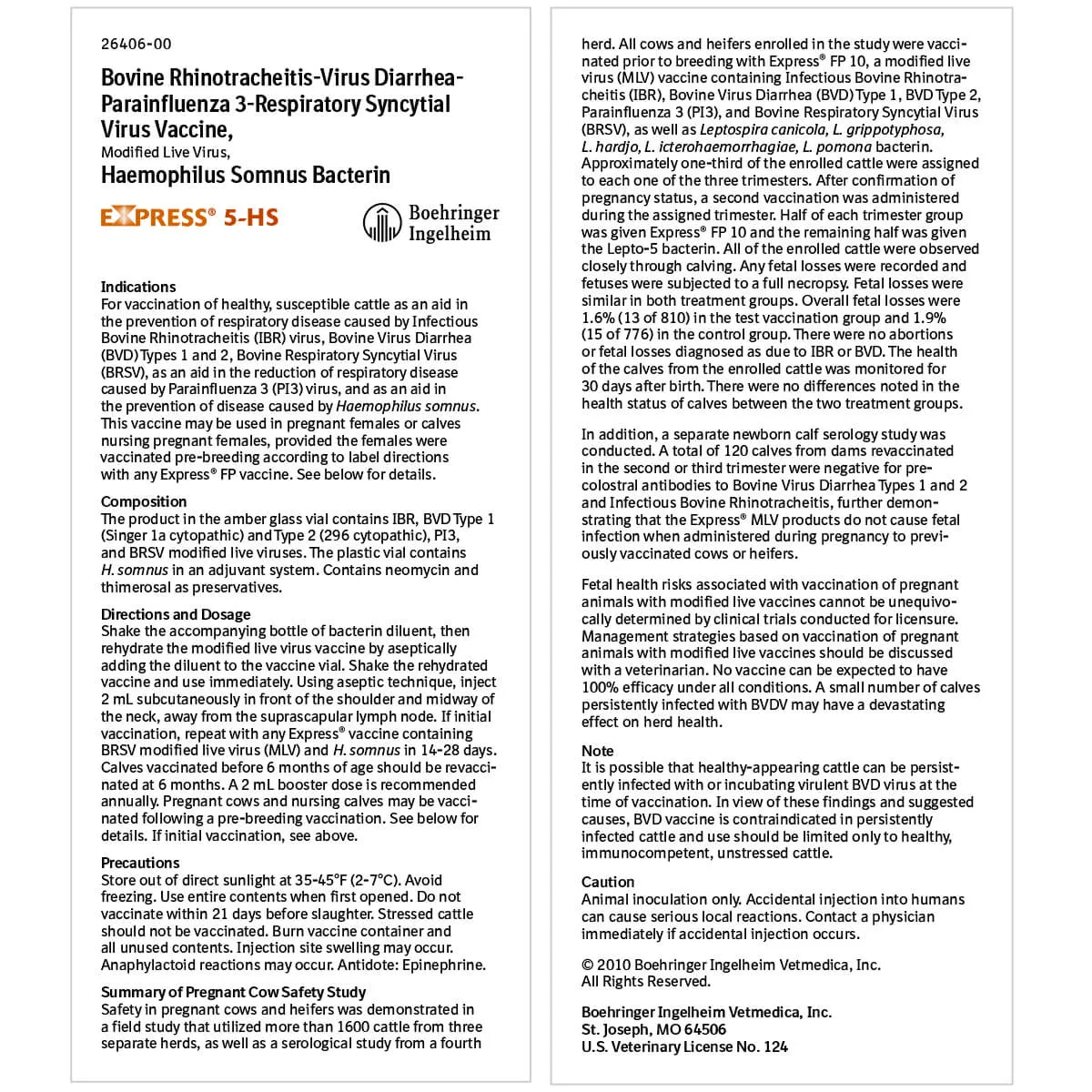 Dosage: 2 ml subcut. If initial vaccination, repeat with any Express vaccine containing BRSV modified-live virus and H. somnus in 14-28 days. Calves vaccinated before 6 months of age should be revaccinated at 6 months. Revaccinate annually. May be used in pregnant females or calves nursing pregnant females, provided the females were vaccinated pre-breeding according to label directions with any Express FP vaccine. 21 day slaughter withdrawal.