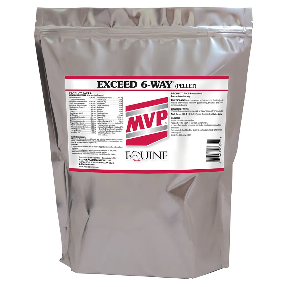 All-in-one pellet supplement for horses provides high levels of key ingredients for multi-level joint, gastric, vascular, hoof, hair coat and digestion support.