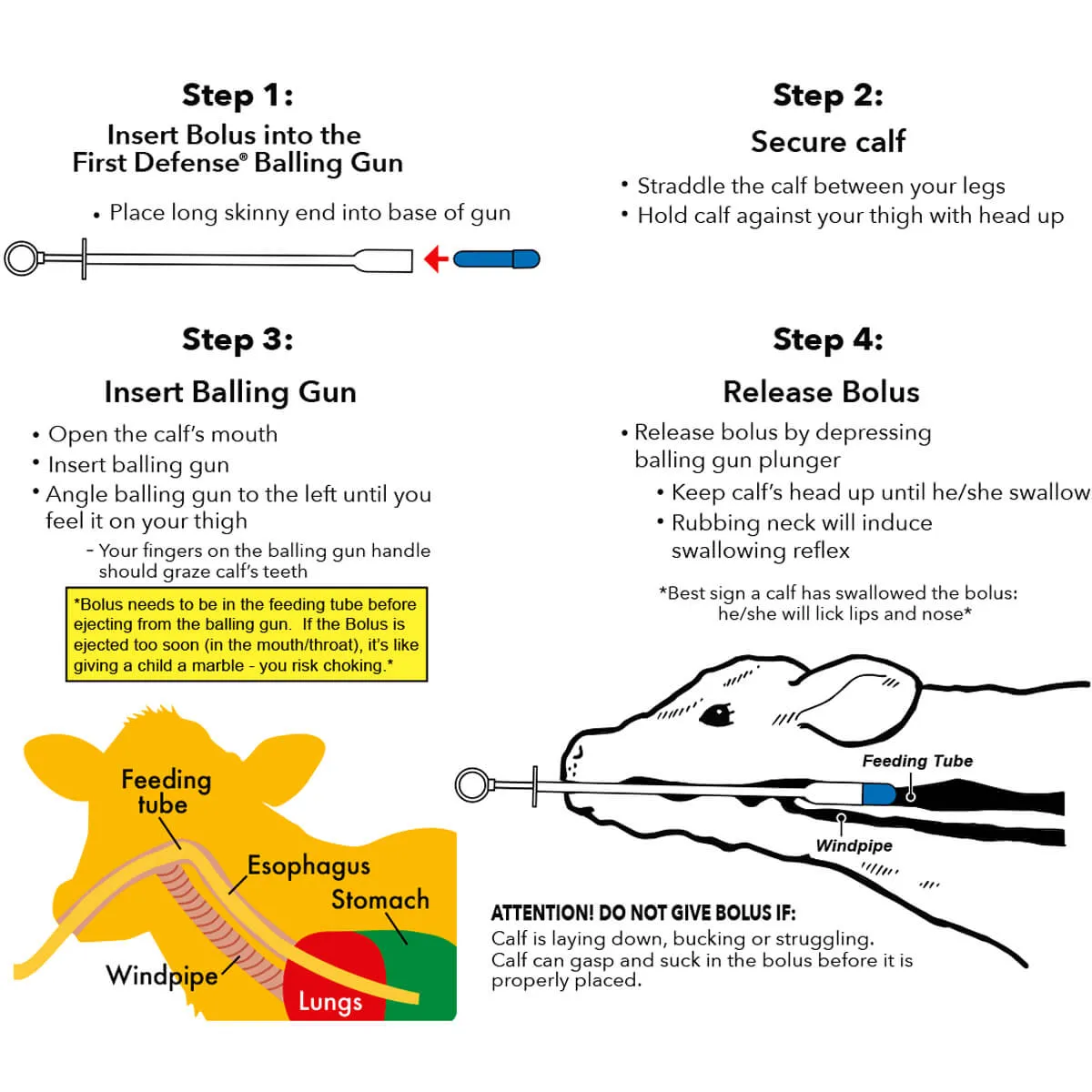 Directions: Administer 1 bolus within the first 12 hours after birth. No slaughter withdrawal. OMRI listed and approved for organic operations, check with your certification agency. No refrigeration or mixing required. For best administration results, use Medium Balling Gun (sold separately).