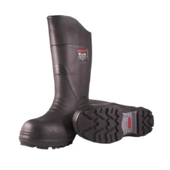 #27251 over-the-sock boot made from Aerex 1.5.5™ – a proprietary, chemical-resistant, thermally-insulative, microcellular polymer. Composite safety toe meets ASTM F2413 M I/75 C/75 EH and will not set-off metal detectors. Tiny air bubbles trapped within the material keep feet warm in the cold and cooler in the heat. Calf-Relief Topline (CRT)™ provides easy on/off and roomier calf space. Cleated outsole spits out debris for grip on indoor and outdoor surfaces. Feature tread wear indicators to show when half the tread has worn away. Beveled heel for reduced back and leg strain.