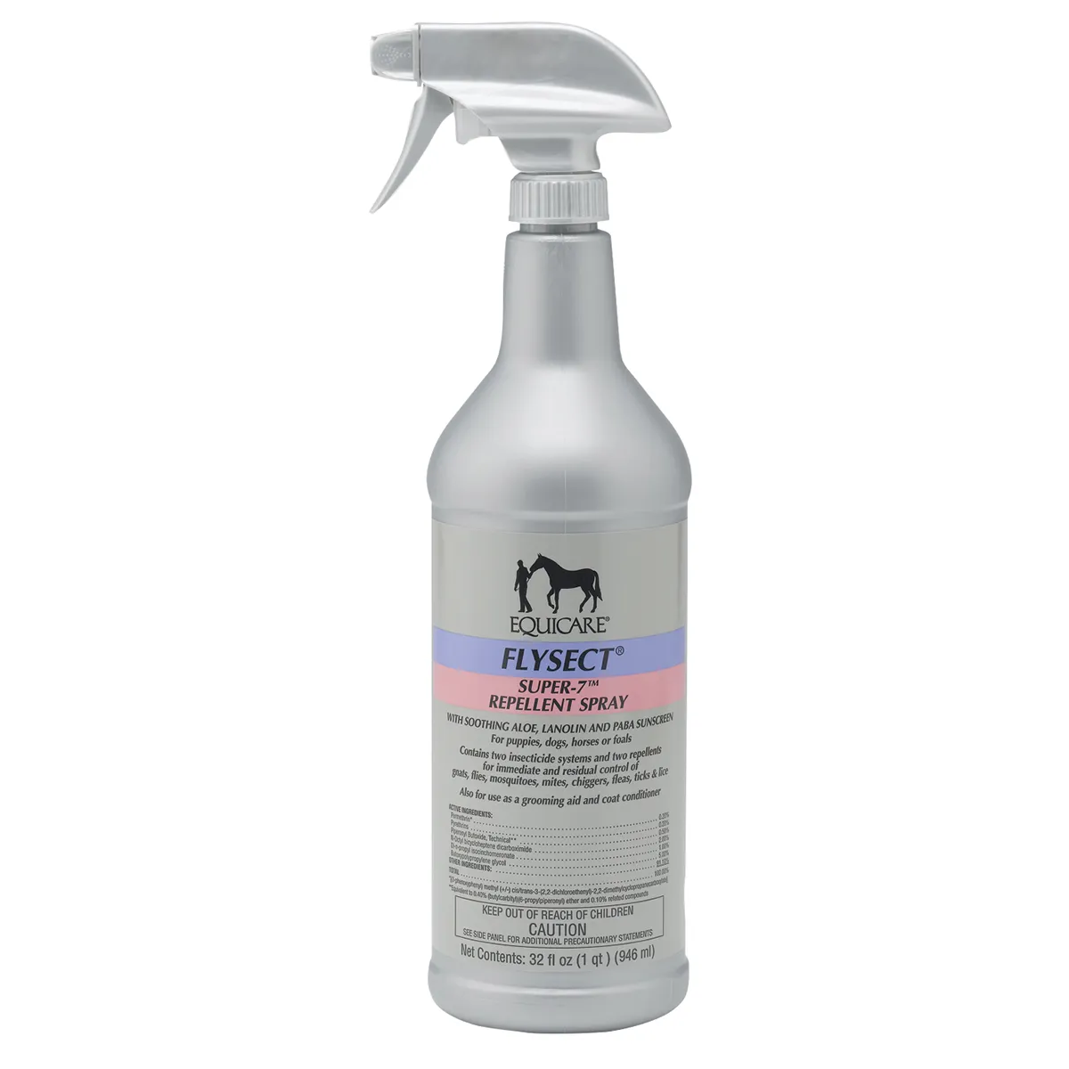 Ready-to-use spray for horses, foals, dogs and puppies that provides immediate and residual control of gnats, flies, mosquitoes, mites, chiggers, fleas, ticks and lice. Soothing aloe and lanolin make Flysect® Super 7™ a great coat conditioner, too. Also contains PABA sunscreen for protection against harmful UV rays. Do not use on nursing foals or puppies under 12 weeks of age.