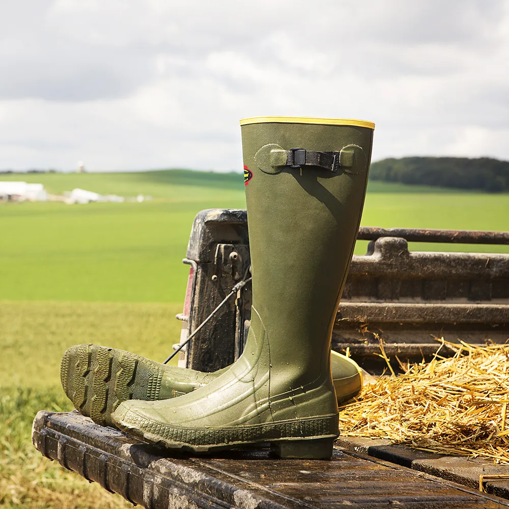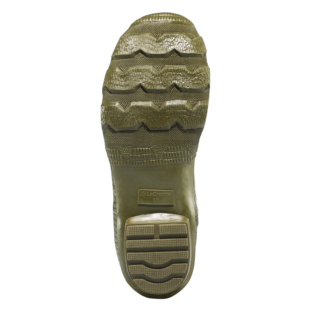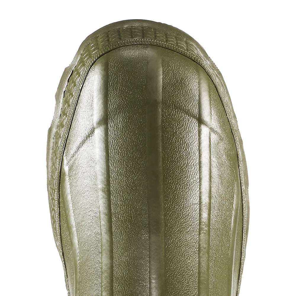 100% waterproof over-the-sock boot remains durable year after year. Comfort rated from 0 to 70°F. Made from proven ZXT rubber with removable EVA footbed. ZXT rubber is ozone-, abrasion- and tear-resistant with added tensile strength. Multilayer rubber on toe and heel plus a double-layer, ribbed vamp for durability. Features fiberglass shank and chevron cleated, slip-resistant traction. Adjustable top strap customizable for a secure fit around calf. Ankle fit ensures secure and comfortable fit around ankles, while gripping top of foot and locking heel in place. 18″ height. Green. Men’s sizes.
