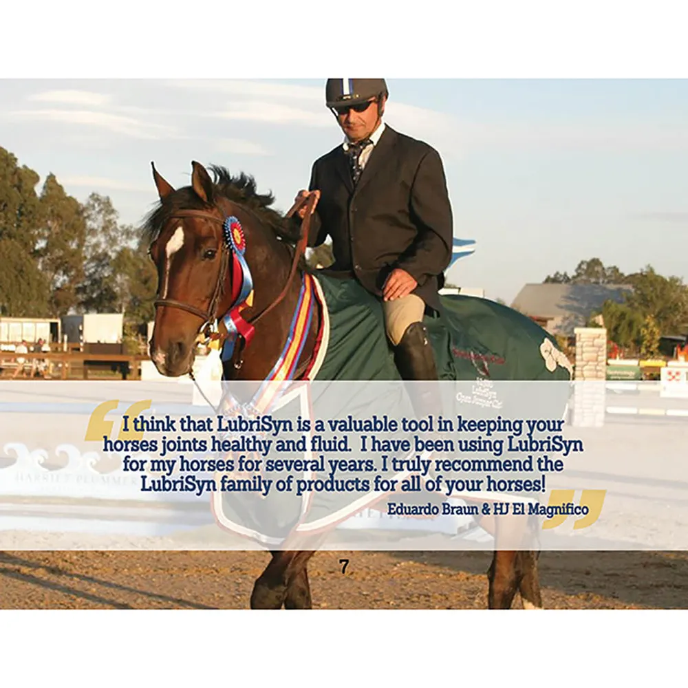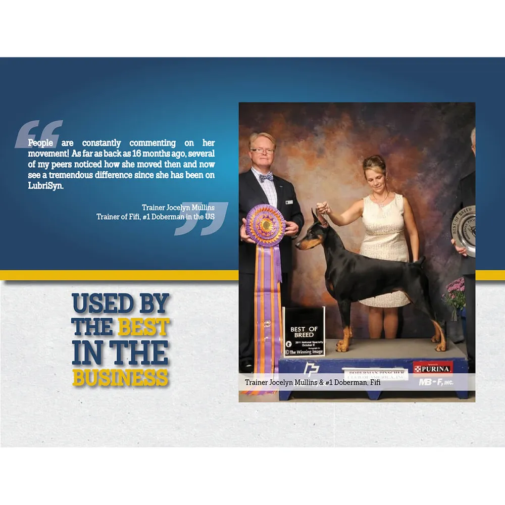 Dosage for horses: Loading – Top-dress 1 oz daily for 3-4 days; Maintenance – Top-dress 1/2 oz daily. Mixes well and sticks to feed. Dosage for dogs: Under 30 lbs – 1 tsp; 30-60 lbs – 1-2 tsp; 60-100 lbs – 2-3 tsp; 100+ lbs – 3+ tsp. Dosage for cats: 1/2 tsp. Mixes well and sticks to feed. The odorless, tasteless and colorless formula has no side effects and no known contraindications. If competing under “zero supplement” regulations, animals will not suffer any negative effects of LubriSyn HA withdrawal during competition. Safe use in pregnant animals or animals intended for breeding has not been proven.