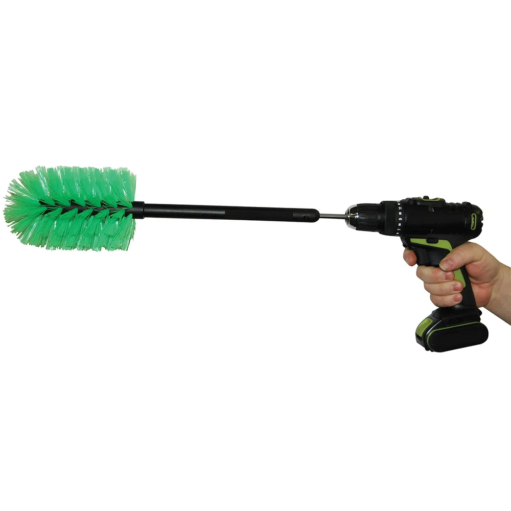 Soft nylon bristle brush will reach every corner and bend of bottle. Features mixture of type 6.6 and 6.12 soft non-scratch bristles. Use with rechargeable power drill at low to medium RPM for maximum brush life. 18.5″L overall, 5.5″W.