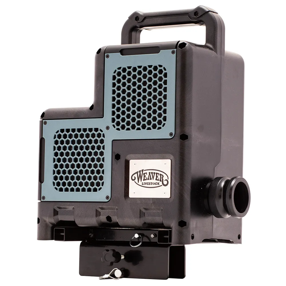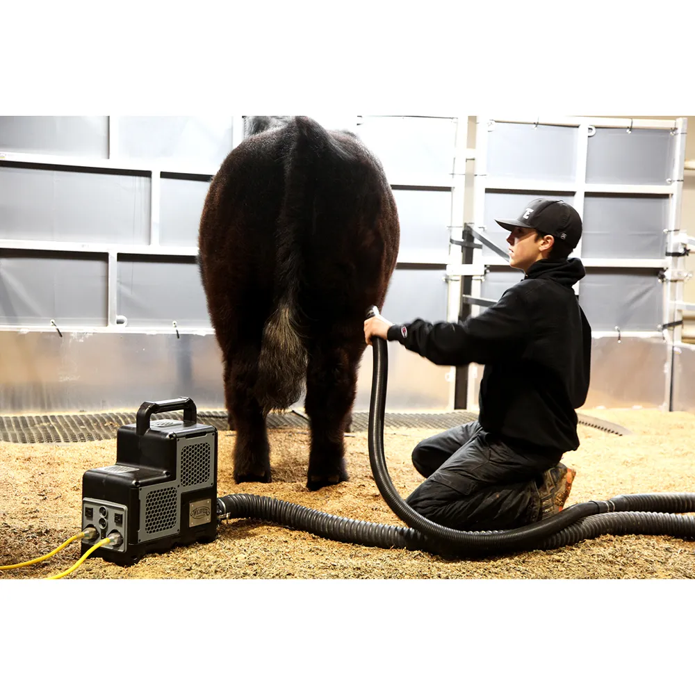 Industry-first design replaces double blower system. Tactically designed with high-tensile strength, glass-filled polycarbonate body for extreme impact resistance and to eliminate the possibility of rust and paint chipping. Specialty nozzle delivers an accurate, concentrated, high-velocity stream of air for fast drying. Air enters side inlets and bypasses blower’s electrical components to emit cooler air out of hose; separate inlet and vent on top cools electrical components. Compact design with handle dramatically reduces the amount of space consumed in the barn, on a trailer or in the stall.Â