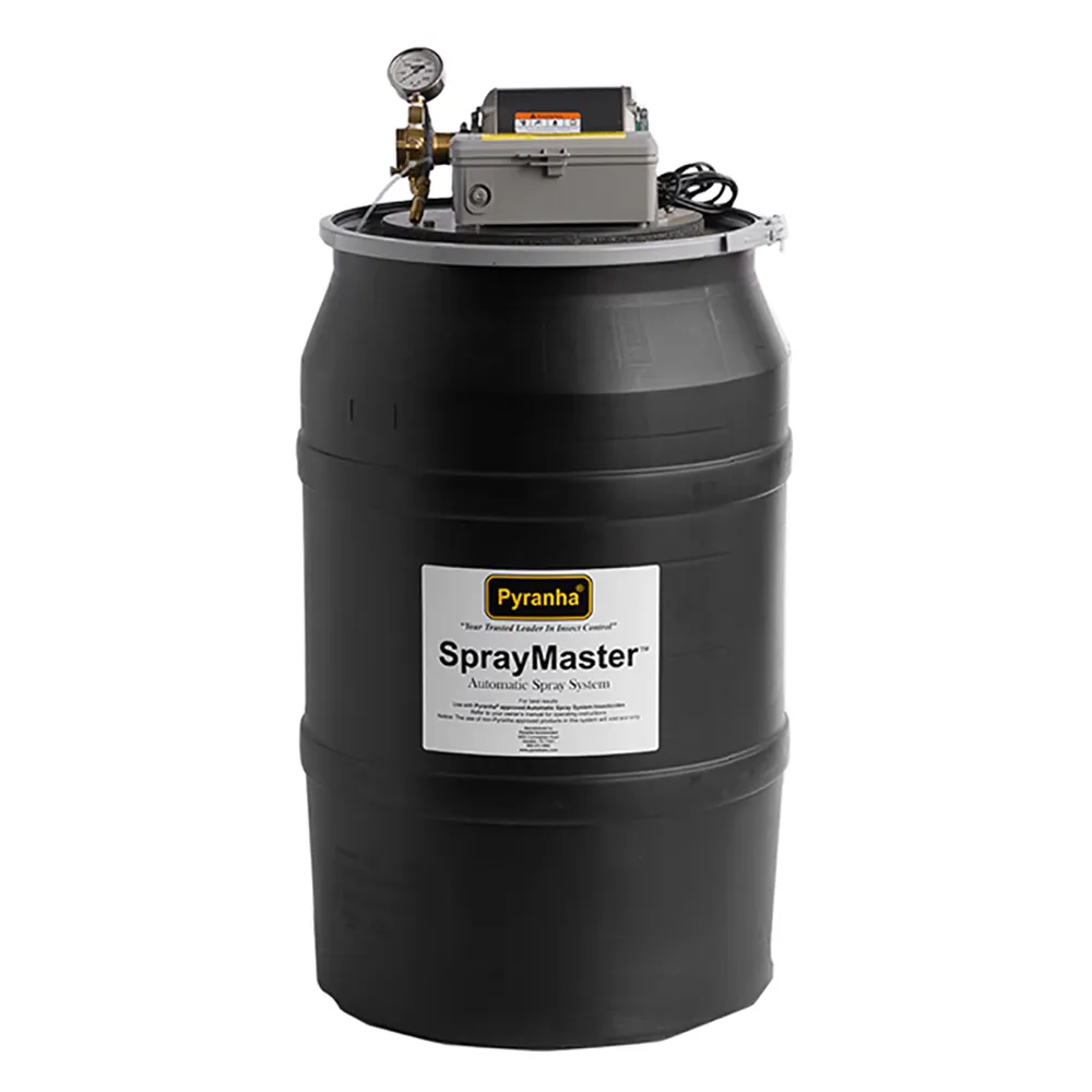 State-of-the-art, easily self-installed solution to control harmful insects in and around horse barns. SprayMaster dispenses a fine mist of Pyranha insecticide (sold separately) for effective control of a broad range of insects. The solid state timer automatically controls the number and duration of spray cycles and the powerful 1/2 hp motor and Procon pump can handle up to 70 nozzles.