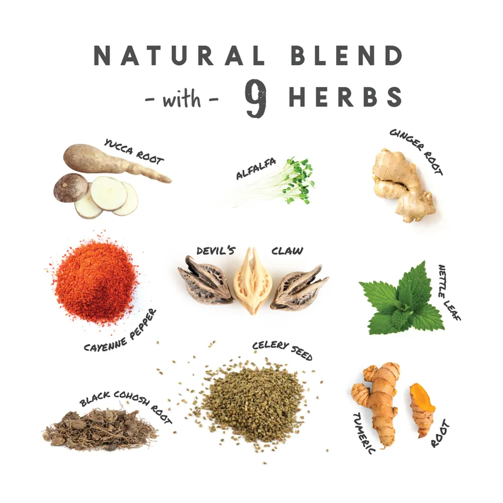 Scoop contains 5,000 mg glucosamine HCl 99%+, 1,025 mg mucopolysaccharides (source of chondroitin sulfate and hyaluronic acid), 500 mg yucca root, 500 mg alfalfa, 100 mg devil’s claw, 100 mg nettle leaf, 50 mg tumeric root, 25 mg celery seed, 25 mg black cohosh root, 25 mg ginger root and 5 mg cayenne pepper.