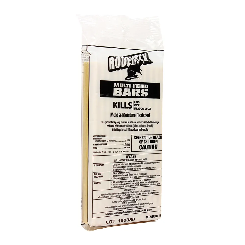 Multiple-feeding, all-weather bait bars kill rodents in just 6-8 days. Highly palatable, high oat content with low bait shyness. Mold and moisture resistant.