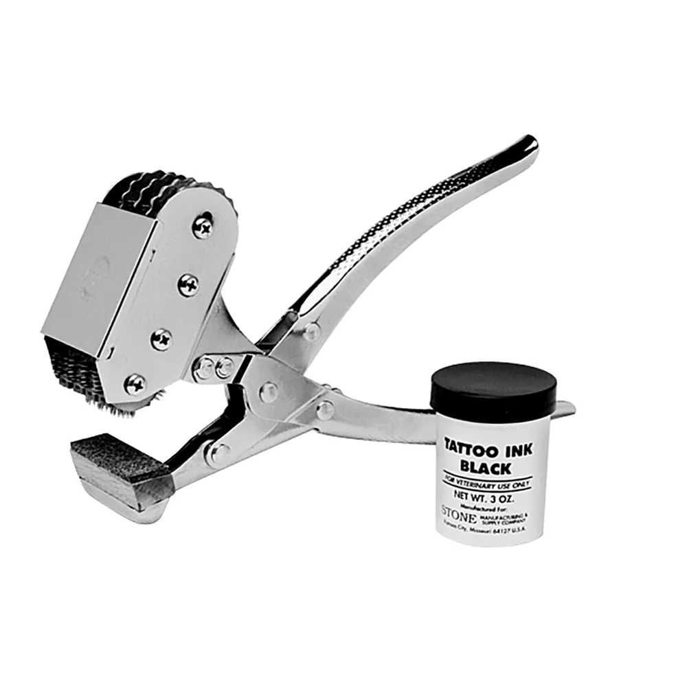 Features digits 0-9 with 2 blanks. Includes pliers and 3 oz ink jar.