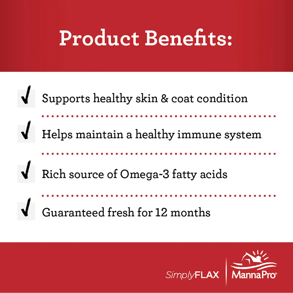 Simply Flax powder is a rich source of omega-3 fatty acids to support healthy skin and coat condition, and help maintain a healthy immune system. Requires no daily maintenance or messy cleanup. Guaranteed fresh for 12 months.Â