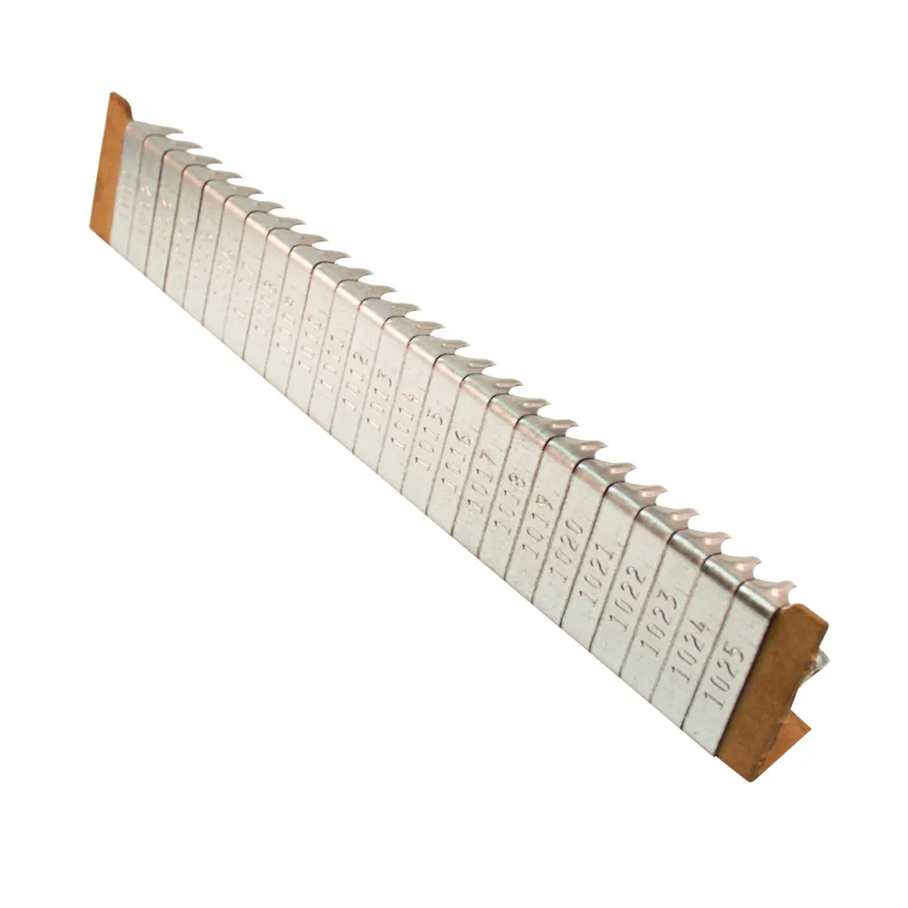 0.042″ plated steel 3/8″W. Packs of 100 tags in numbered sets.