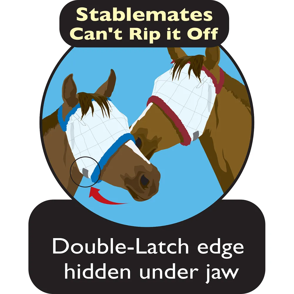 For additional safety to younger horses, the Foal and Yearling sizes do not have the double-latch closure. This allows the mask to come off easier in case of emergency.