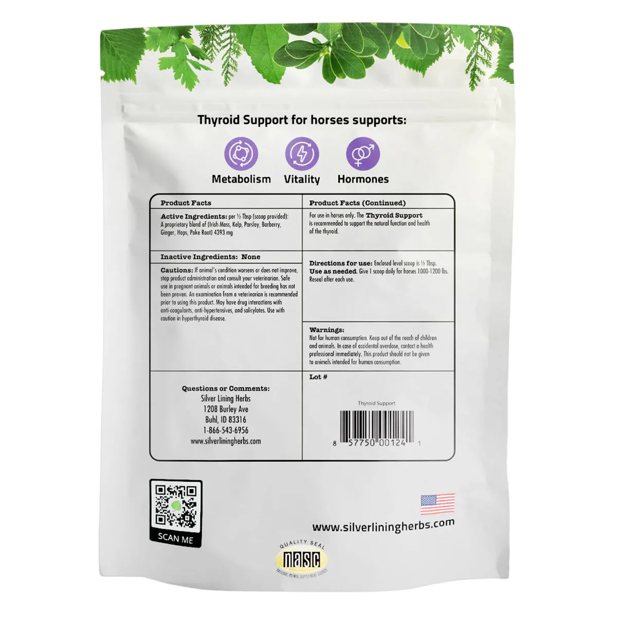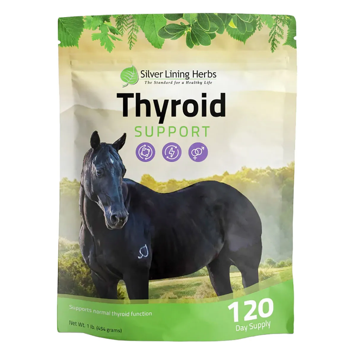 Use Thyroid Support for a properly functioning thyroid, to help maintain weight and normalize the amount of fat and muscle on the neck and tail head. Supports a healthy body condition and normal breathing. May be beneficial for a healthy coat, maintaining normal eye health, and for horses with difficulty in correcting weight through normal dietary adjustments. For use in horses only.