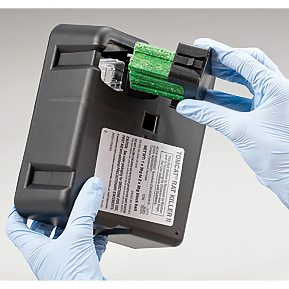 Refillable Motomco Tomcat Rat Killer II bait station is child and dog resistant. Includes 15, 30 gm Tomcat with Bromethalin Chunx bait refills. Features a clear window in lid for easy monitoring. For use indoors and out. Use 1 station per placement, spaced at 15-30 feet intervals. Each 30 gm block kills up to 3 rats.