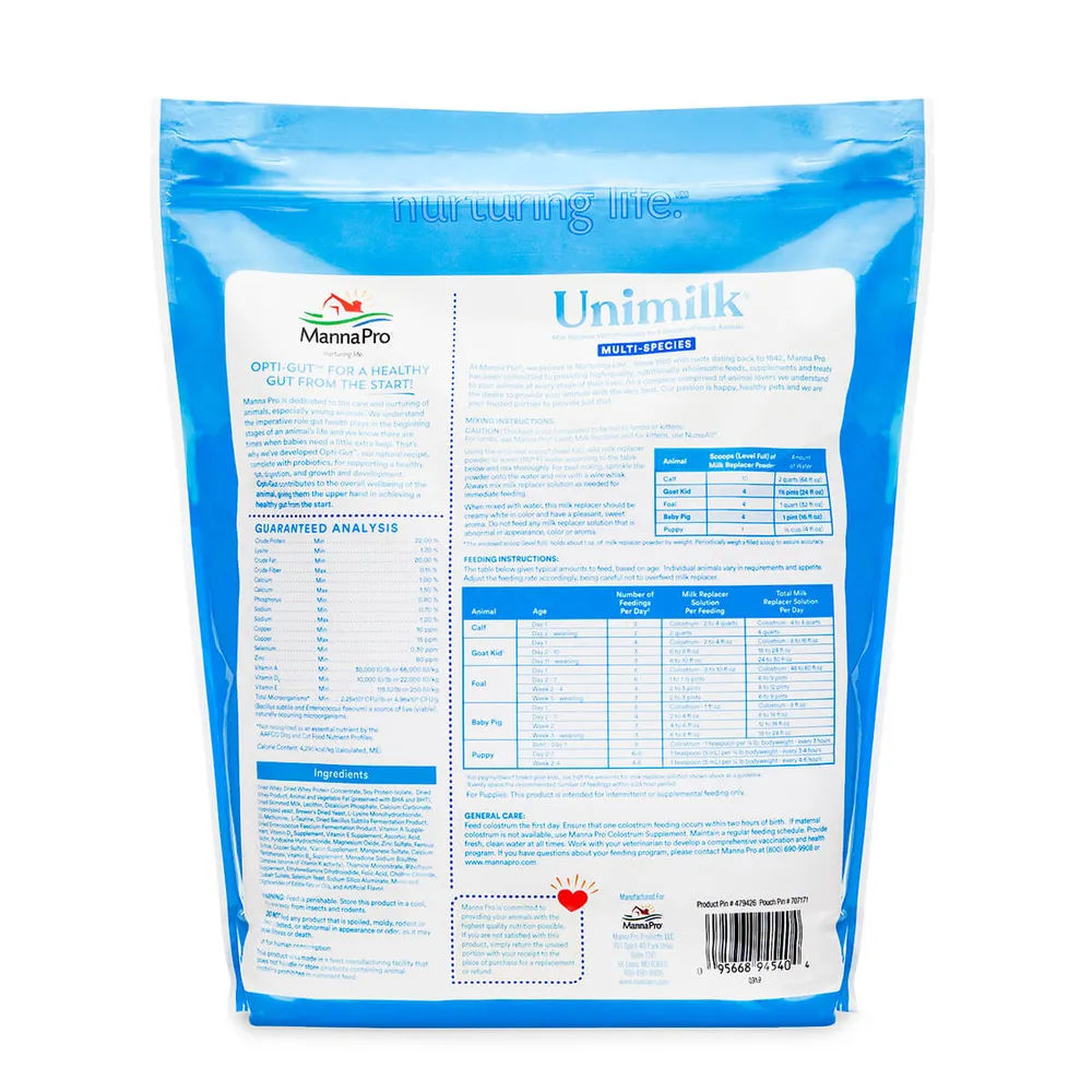 Directions: Day 1 – Feed colostrum. If maternal colostrum is not available, use Manna Pro Colostrum Supplement. Day 2 through weaning – Mix Unimilk with warm water for immediate use; feed 2 quarts solution twice daily. See label for species-specific feeding instructions.